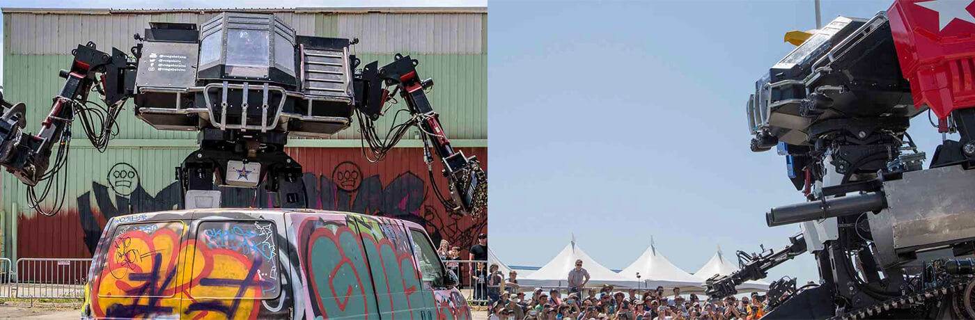 「ロボットに乗って操縦する」。そんな子どもの夢のようなことをが実現したのが「MEGABOTS」。アメリカのMegabots社が開発した巨大ロボットで、そのスペックは全長4.5メートル、重量6トン、出力24馬力。さらに右のアームには重さ1キロのペイント弾を時速190キロ以上で発射するバズーカ、左のアームには1300キロ以上もの握力を誇る爪を装備するなどSFの世界が現実に再現されたかのようなロマンがあふれる。