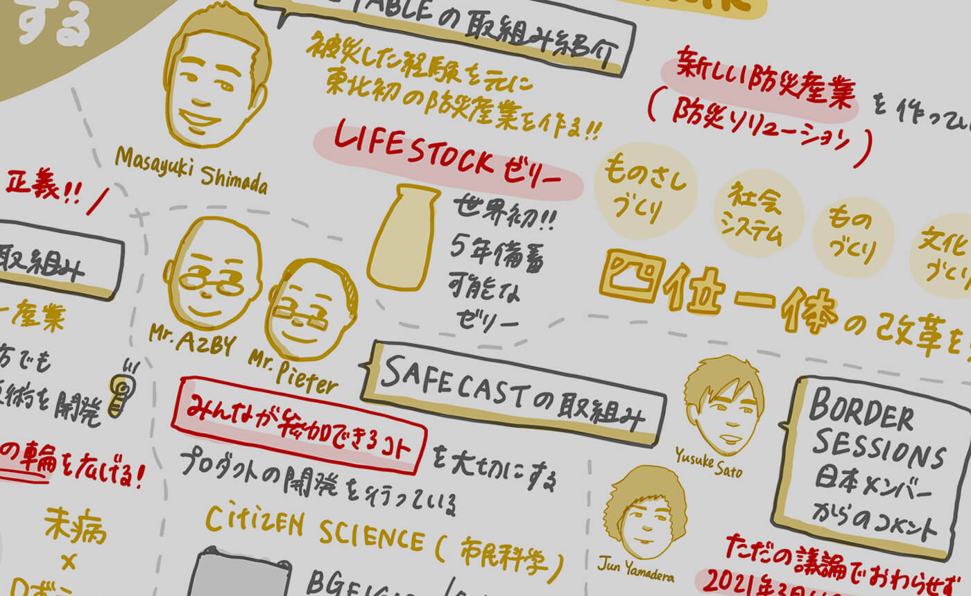 実行委員会の1社である読売新聞社「YOMIURI BRAND STUIDO」と 「BORDER SESSIONS」 により防災をテーマとしたセッションを設計・開催するほか、セッション・ワークショップメンバーとしても参画し、新たな防災産業の潮流を描き、ポストコロナ時代を見据えた防災プロダクトのプロトタイプを考察しました。